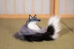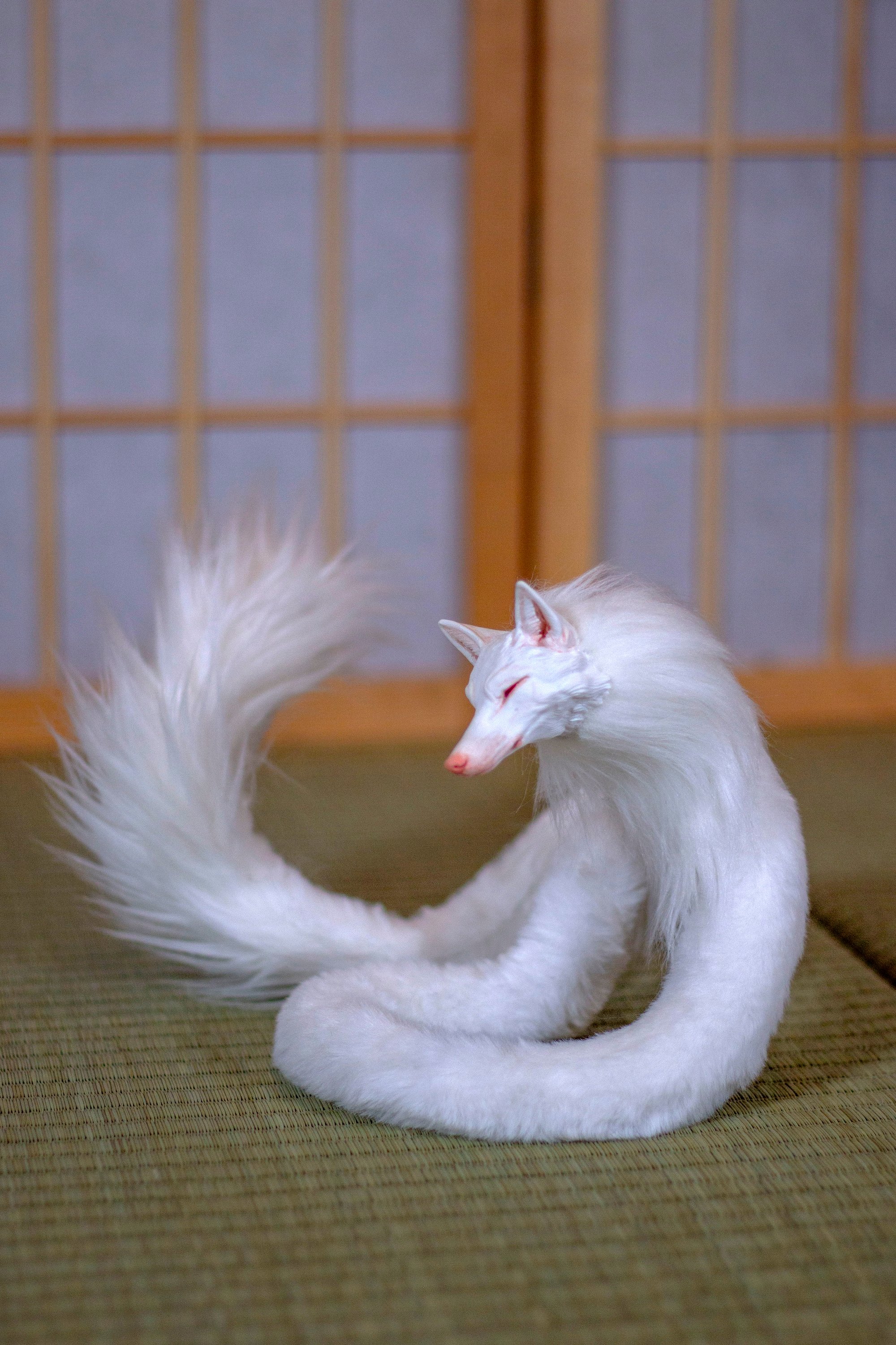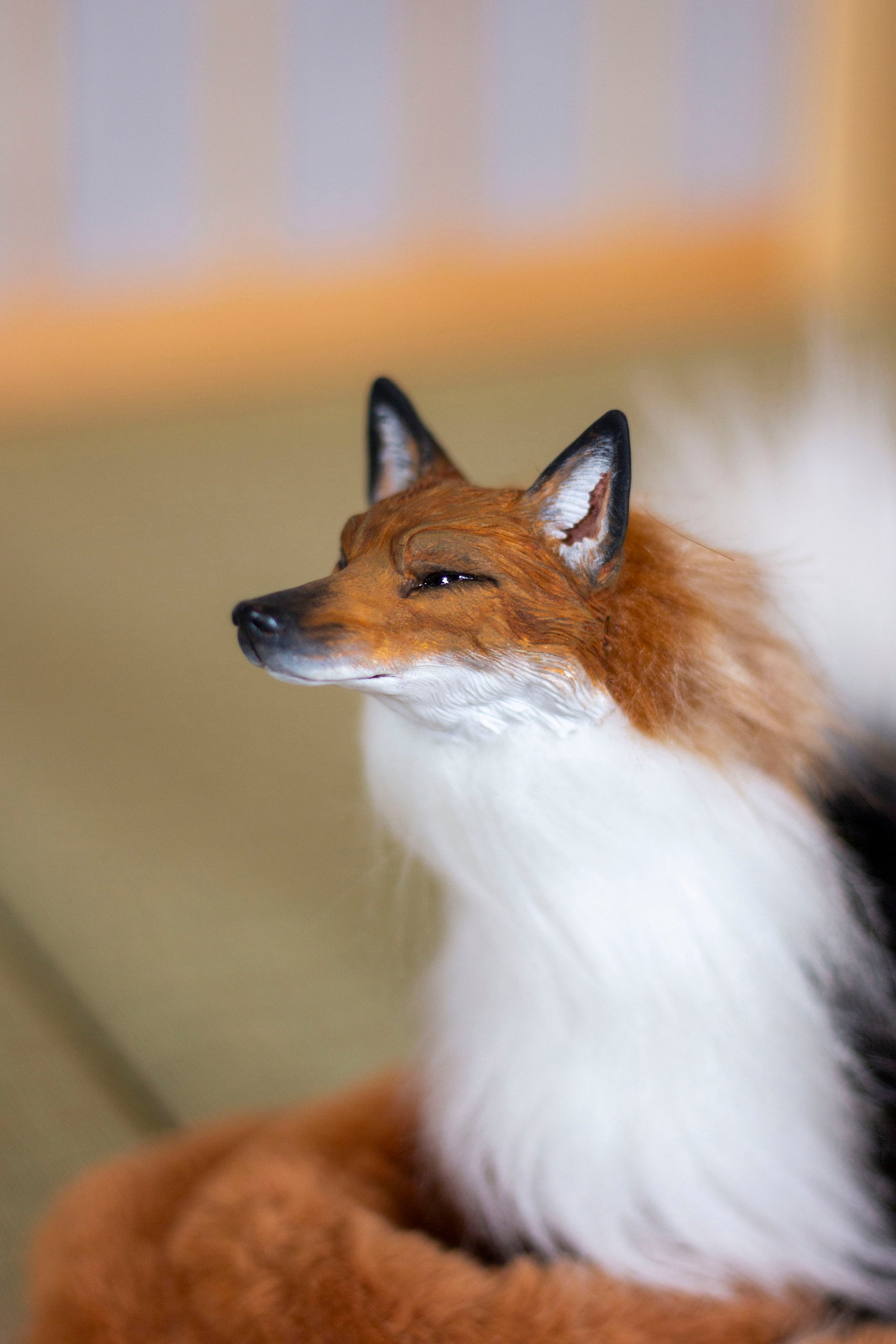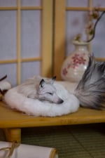Poseable Kudagitsune artdoll. Each doll measures 95cm long (37,4 inches) aprox. Their head is 3D modelled and printed in resin, hand painted with acrylic paint and attatched to an inner articulated plastic armature that allows poseability. Body is hand sewn using synthetic fur fabric (vegan friendly).