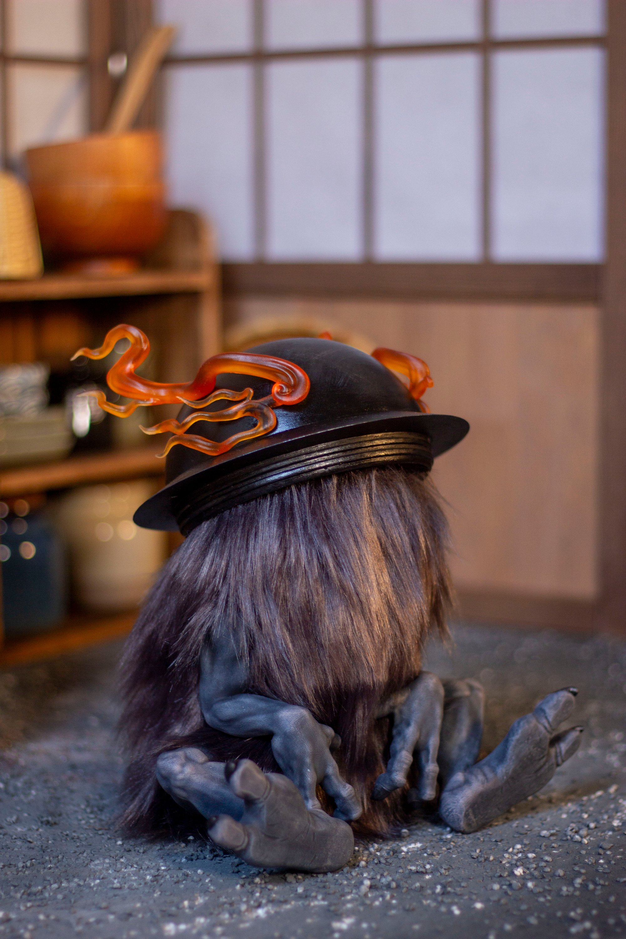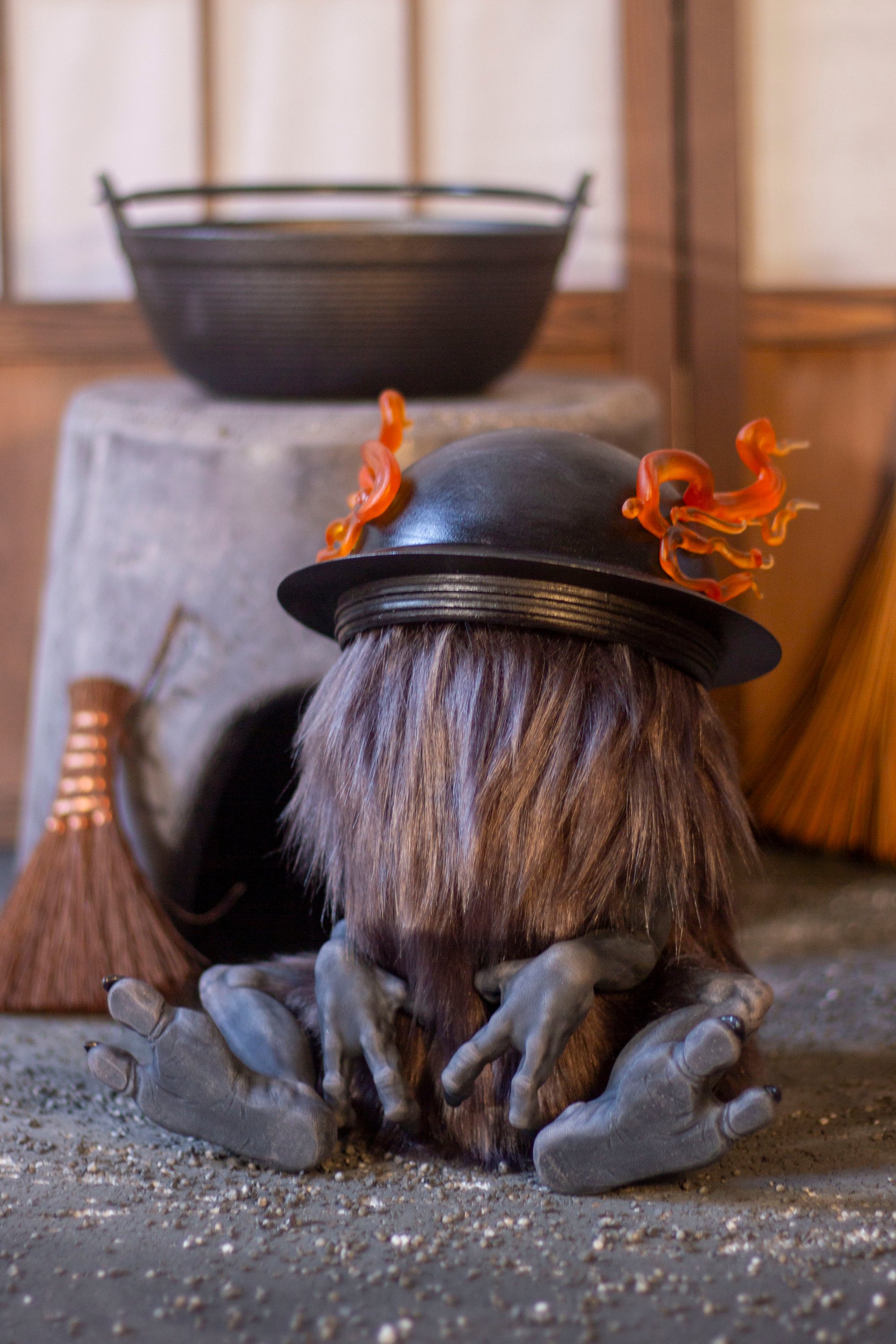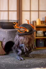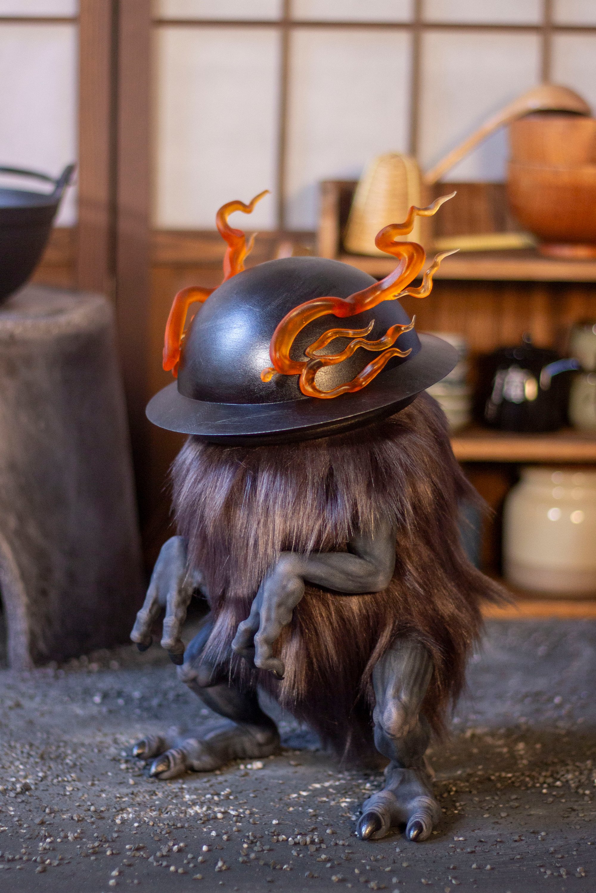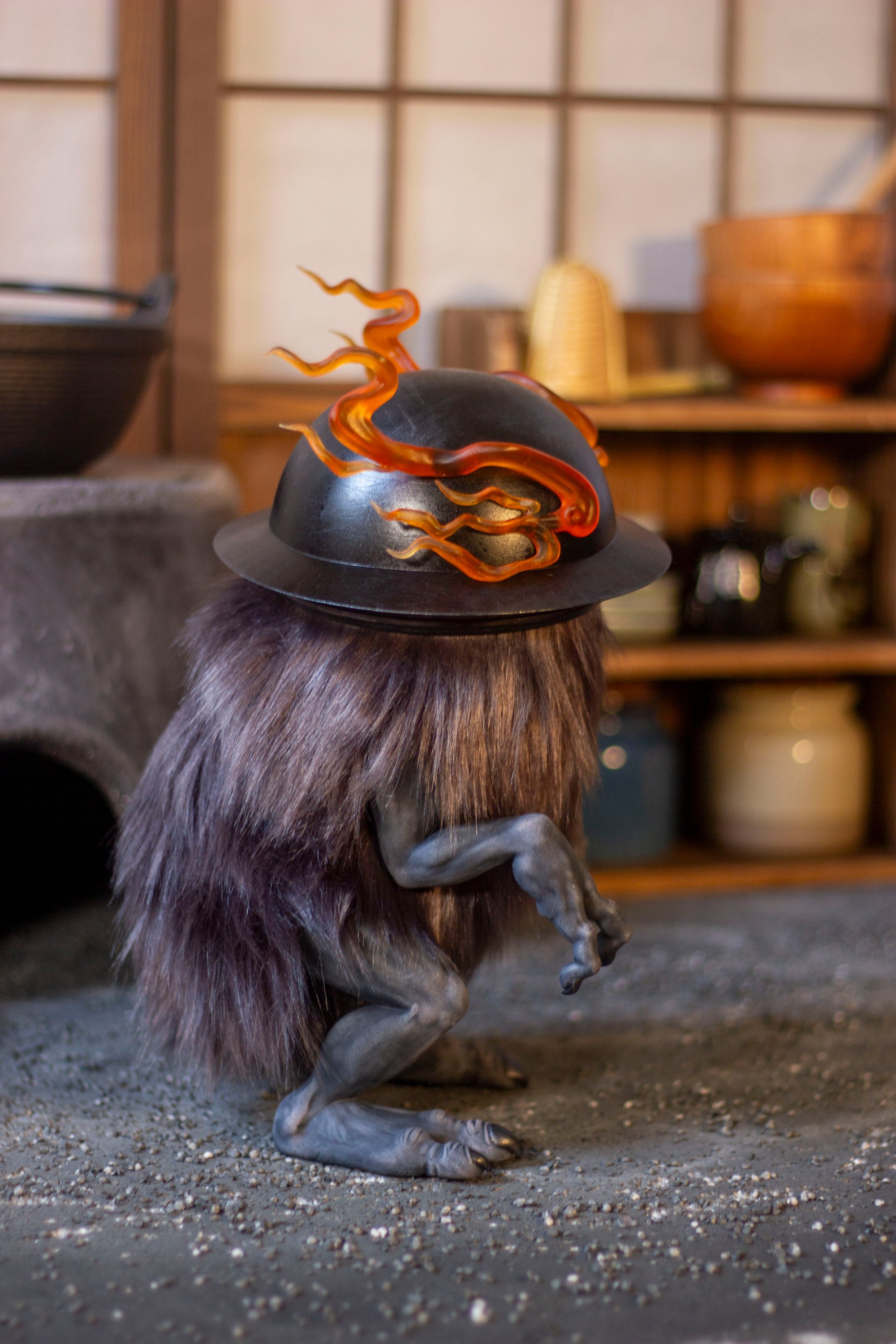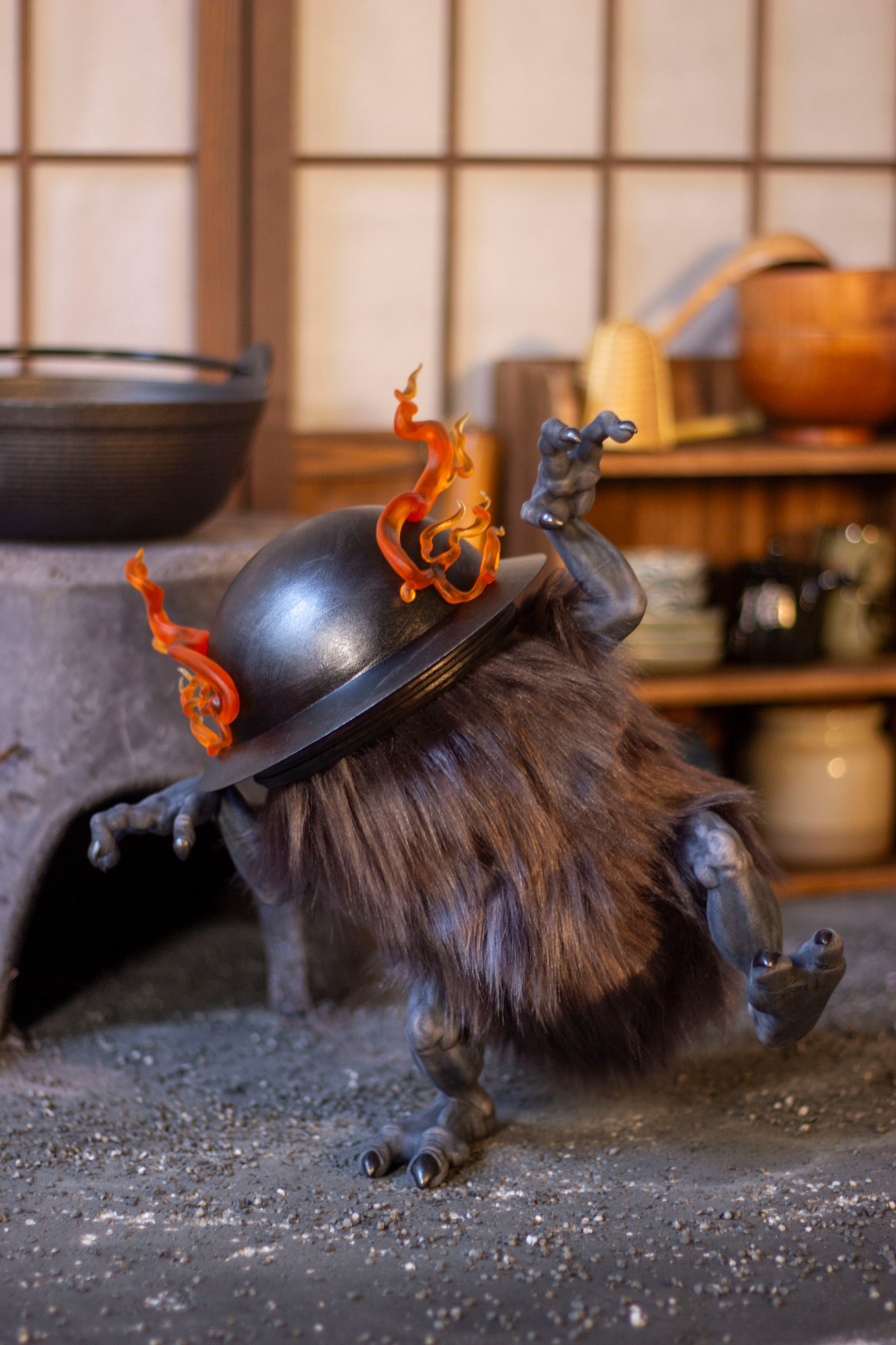 "Narigama are a tsukumogami of kama, iron kettles or cauldrons used to cook rice in old Japanese kitchens. They have long arms and legs. Their bodies are covered in dark hair as if wearing an animal’s pelt. Flames lick the sides of the kettle which either serves as their head.